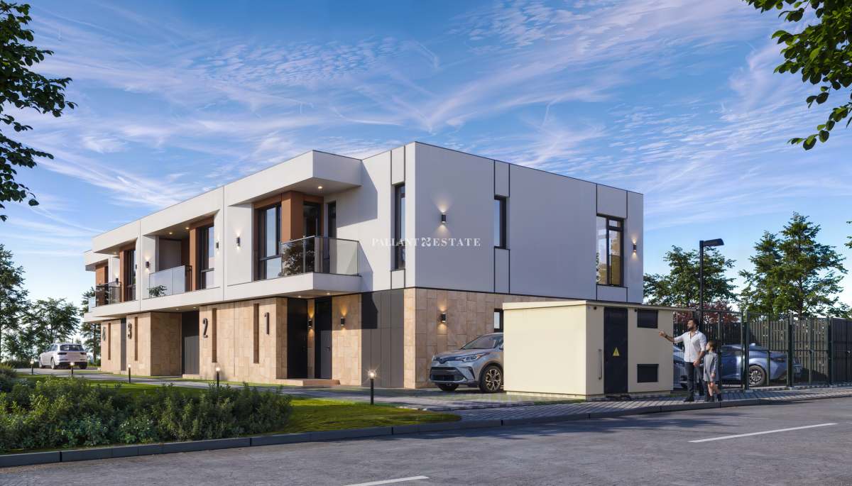 A gated complex of four "neighborhood-type" houses with shared landscaped and developed areas, secured parking spaces — two per house — and video surveillance of entry zones and the parking lot. The buildings are sold by the developer in a fully finished state according to Bulgarian National Standards (BDS).