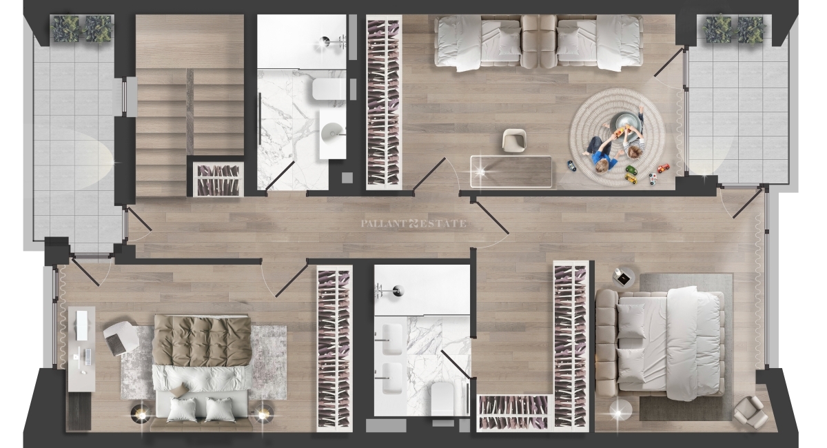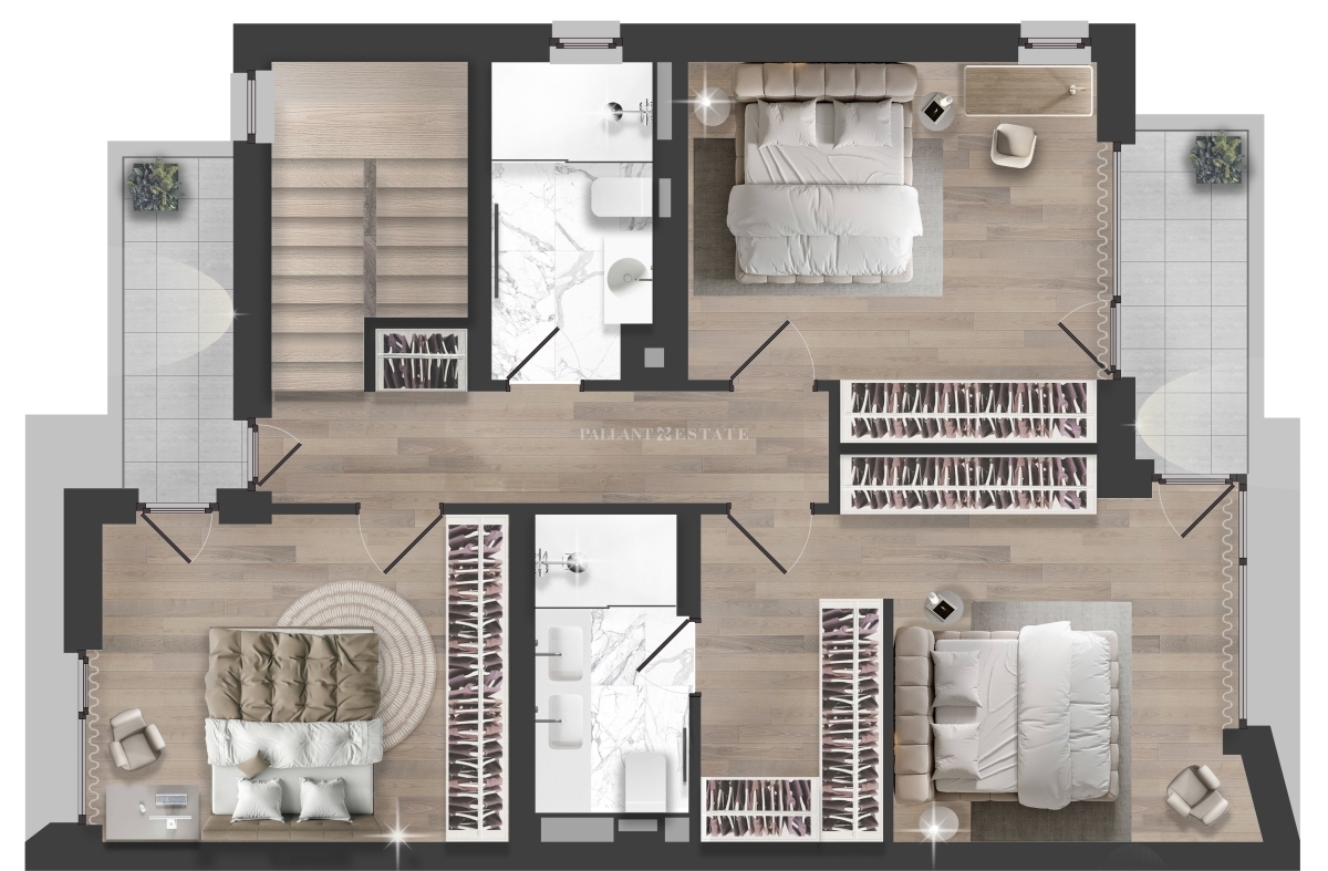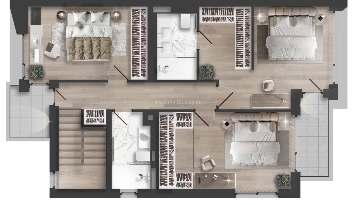 Terraces and balconies: Fully finished with frost-resistant granite tiles, double-layer waterproofing, designer railings, and stone sills.