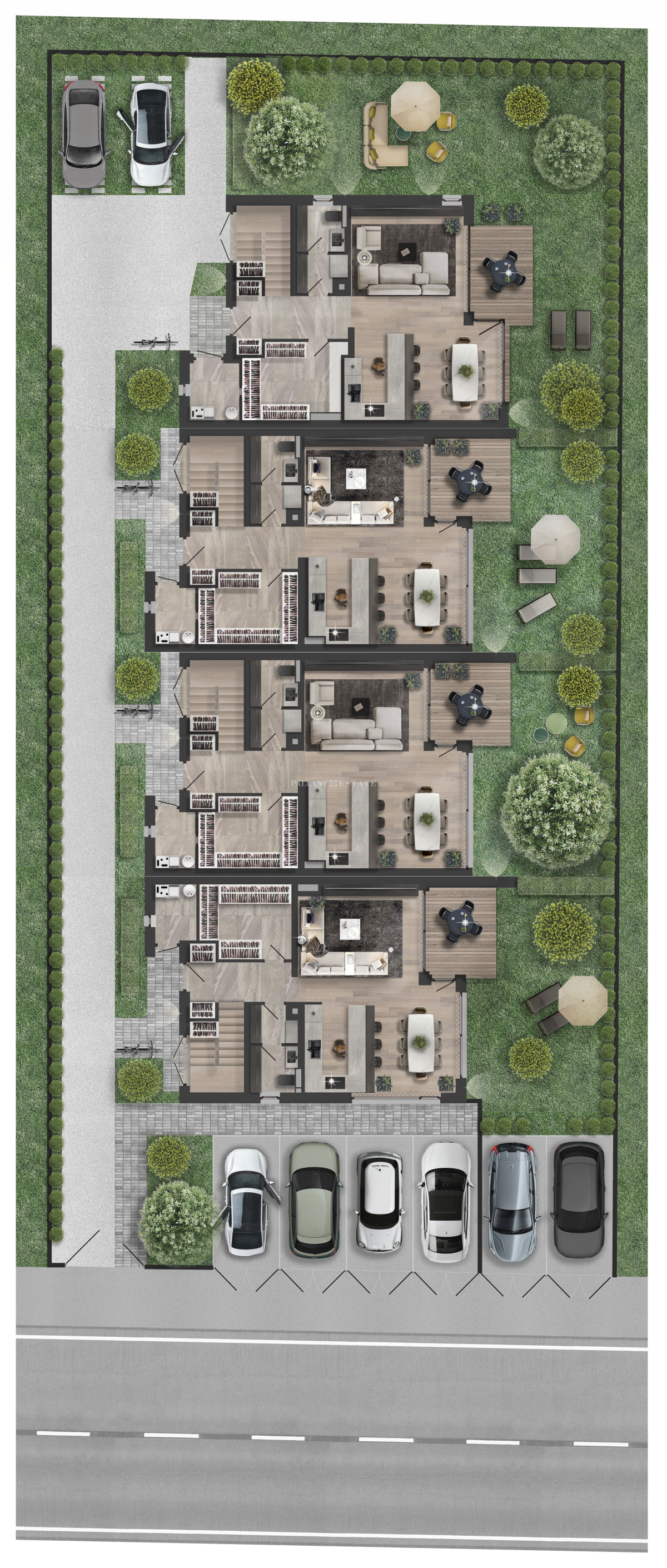 Each house comes with a private landscaped yard from the developer. Three houses feature yards ranging from 42 to 43 sq.m, while the fourth boasts a spacious yard of 74 sq.m.
