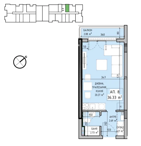 One-room apartment     A   2   A-08   41.84 sq. m.   36.33 sq. m.   5.51 sq. m.     2249.00 EUR / кв.м 94 098 EUR